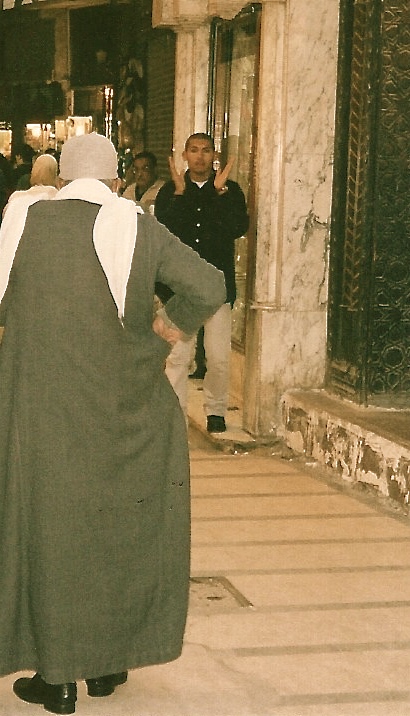 On the ride back to Mena House we pass a volleyball game where, for lack of poles, men are cheerfully holding up the net for their friends. At various intersections, guards with rifles and machine guns leaning casually from the windows of limestone towers.